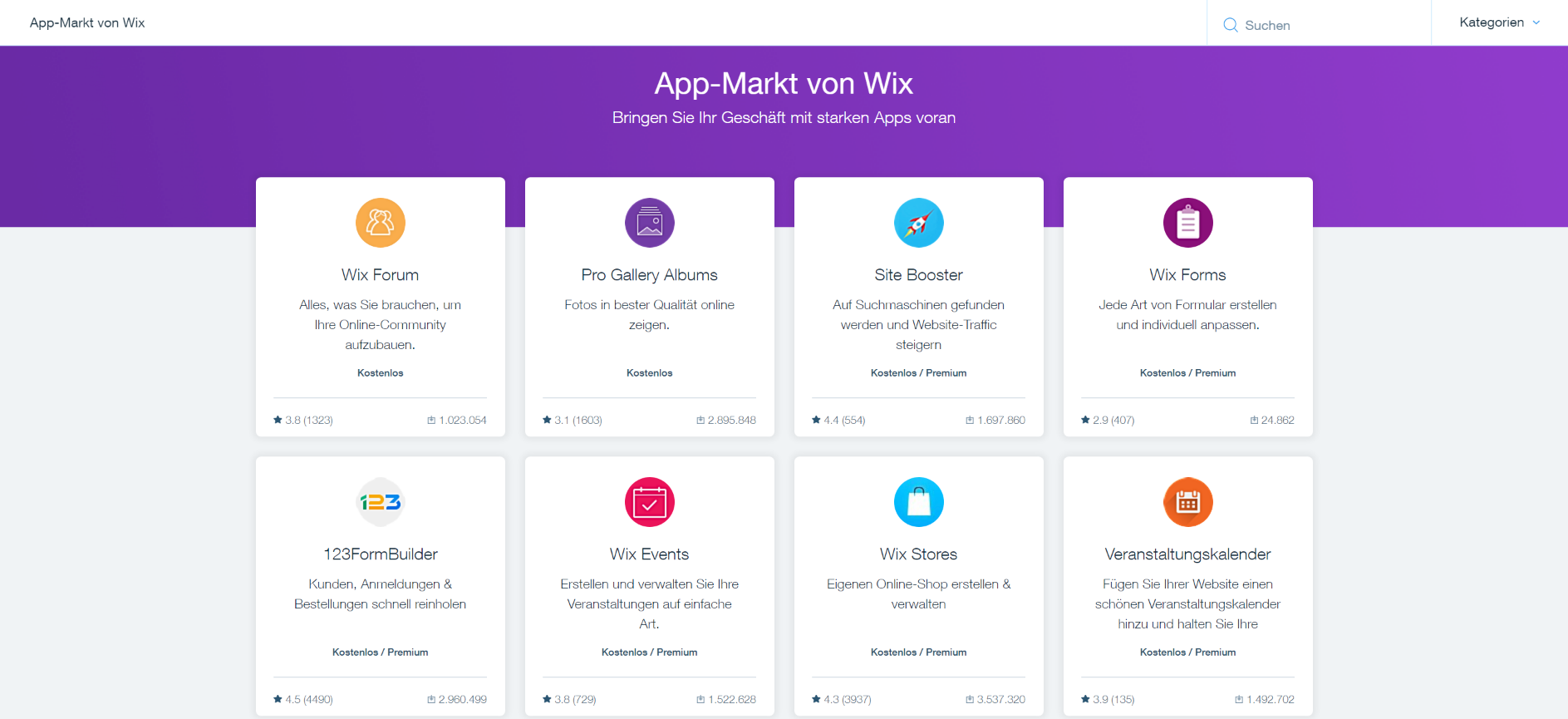 Der App-Markt ist vermutlich das eindrucksvollste und auffälligste Alleinstellungsmerkmal von Wix. Mit Apps, auch Plugins, Addons oder Erweiterungen genannt, lassen sich zusätzliche Seitenelemente und Funktionen zur Webseite hinzufügen. Die dadurch entstehende Flexibilität war immer einer der großen Vorteile von WordPress und anderen CM-Systemen. Zu den vielfältigen Apps zählen unter anderem Blog-, Shop- und Foren-Elemente, DSGVO-kompatible Cookie-Hinweise, Formulare, Besucher-Zähler, Google AdSense, Facebook- und Twitter-Buttons, Mediaplayer und mehr. Mittlerweile lassen sich sogar eigene Apps entwickeln und auf dem App-Markt veröffentlichen.